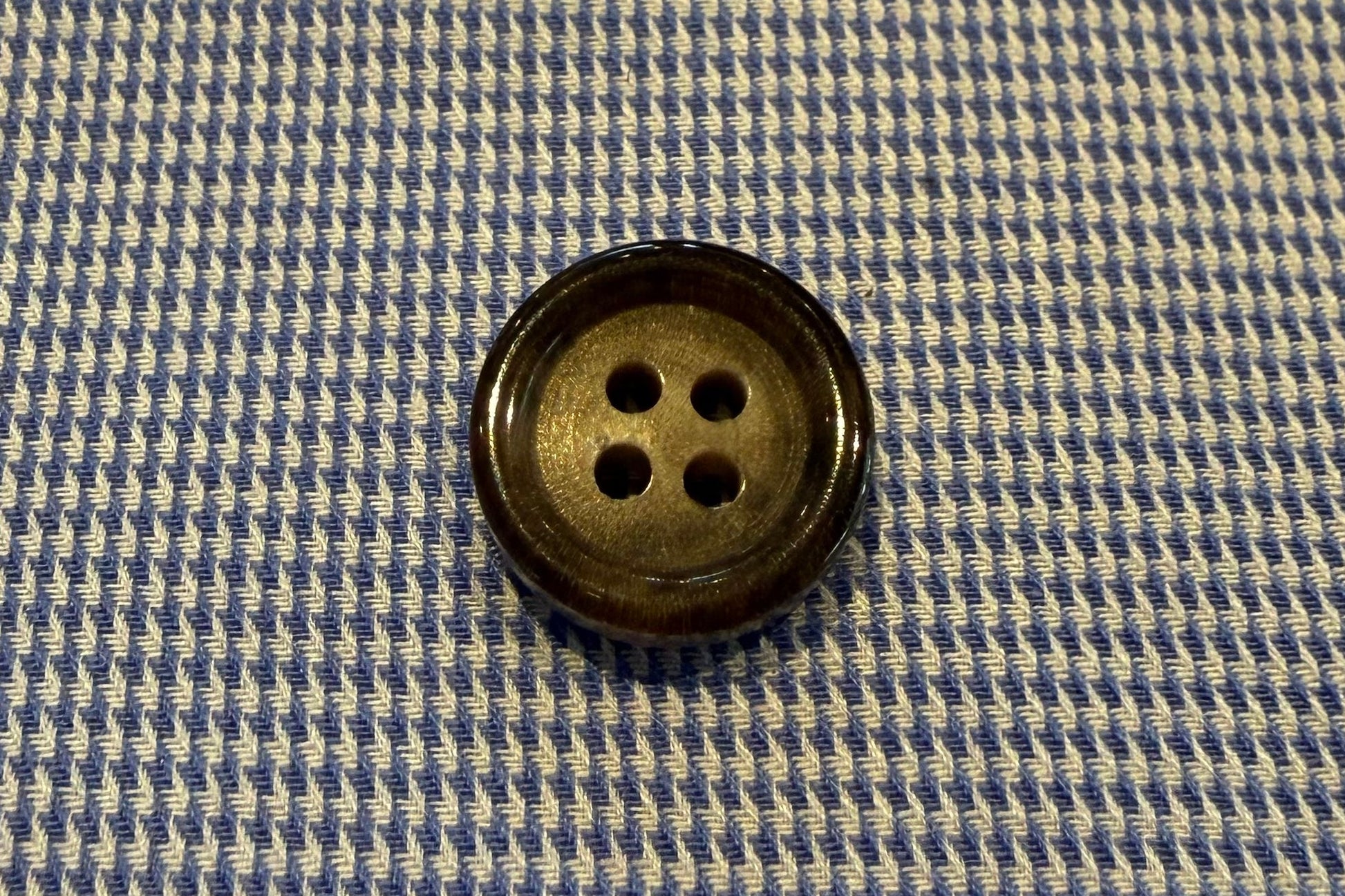 Gorgeous 4-hole suit button in buffalo horn. Dark brown with cream highlights.