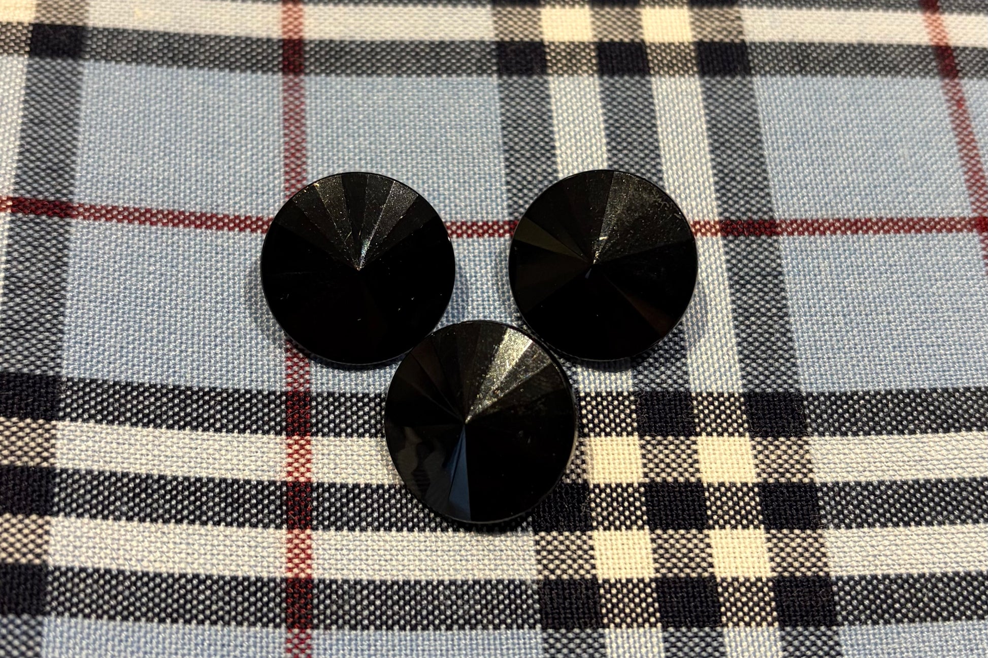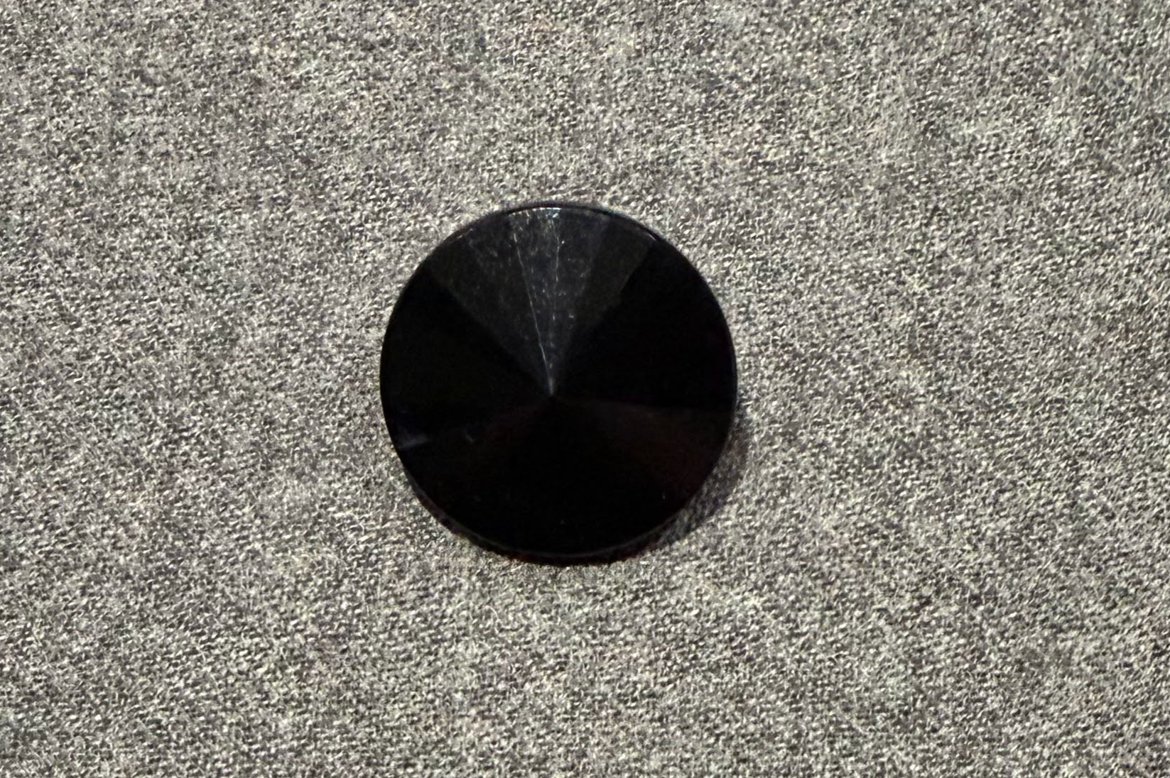 A retro black button in plastic that is slightly conical. There's a point in the centre and then very gentle ridges toward the outer circumference.